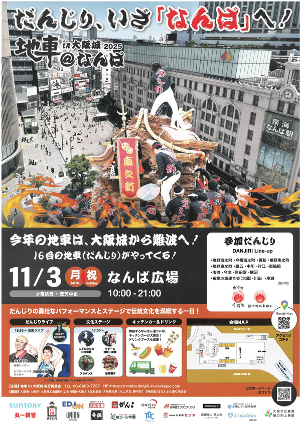 大阪市近郊の地車(だんじり)を約16台集結させて、パフォーマンスや地車囃子を披露。