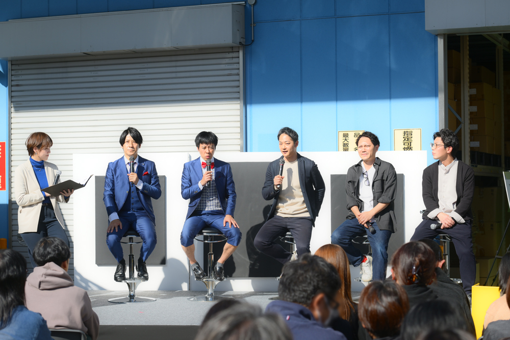 続いて、ゲストとのトークセッションでは、「アーティスト・イン・ファクトリー東大阪2025」をプロデュースした株式会社IDEABLE WORKS代表取締役 寺本大修氏、そしてこの日の会場でもあり、連携企画「オープンファクトリーこーばへ行こう!2025」の実行委員でもある三和紙業株式会社 代表取締役 松田加奈氏がステージに。