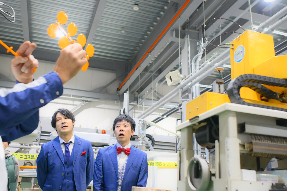 まずステージに登場したのは、「モノづくり東大阪応援大使」を務めるモンスターエンジン(西森洋一氏、大林健二氏)です。東大阪の鉄工所を実家に持つ西森氏が披露する、まち工場ならではの緻密なディテールや職人のこだわりに、お客さんは思わず笑い声をあげます。