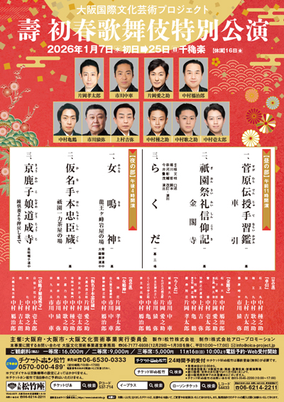 2025年11月18日(火)より、大阪松竹座、南座、歌舞伎座、新橋演舞場にてそれぞれチケットを購入できます。