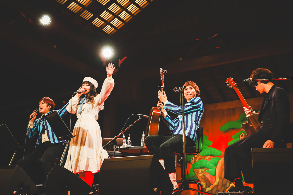 続けて、みずみずしいメロディーと爽やかな歌詞が印象的な新曲「春色ベイビーブルー」をライブ初披露し、観客も大いに盛り上がりました。松尾さんは「能の舞台すごかったですね。めちゃめちゃカッコ良くて、神聖すぎてドキドキしました。日本の文化が受け継がれて、今ロックと能というカルチャーが大阪で生まれていることがとても素敵」とうれしそうに伝えました。亀本さんは舞台を見渡して「音と木って相性が良いんですよね。有機的な感覚で音程をとれる。自然体でできる感じ。過去一番のレベルで演奏しやすい」と笑顔を浮かべました。松尾さんは「心に訴えかけてくる歴史と能のすごさに息を飲みました。この舞台は色々な時代を見てきた。今日ここに立てて本当に嬉しいです」と述べて、最後に自身が学生の頃から歌い続けている『大人になったら』を情感豊かに歌い上げました。彼らの音楽に滲む哀愁やノスタルジーが能舞台の雰囲気と融合して、会場は大きな感動に包まれました。