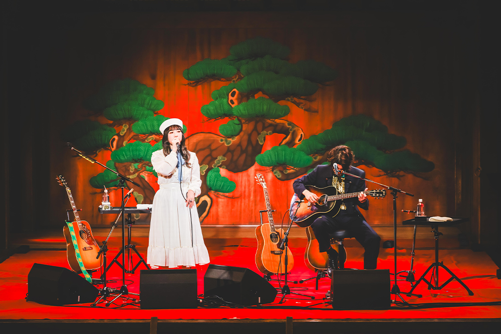 続いてはGLIM SPANKYが登場。松尾レミさん(Vo.&Gt)のハスキーボーカルと亀本寛貴さん(Gt)のギターで、『怒りをくれよ』『赤い轍』『ひみつを君に』をパワフルかつブルージーに歌いあげ、能楽堂の空気を一変させました。