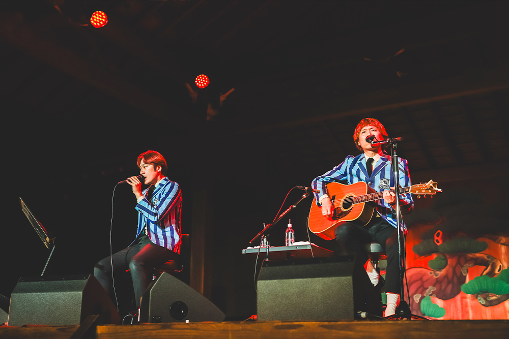 MaynardさんとBlaiseさんは宮城県在住のカナダ人兄弟。Maynardさんは演劇を学んでいた学生時代、論文作成で古典芸能のひとつとして「能楽」を題材に選び、集めた資料に掲載されていた「大槻能楽堂」の舞台を覚えていたという。Blaiseさんも歌舞伎が好きだったり、趣味で能楽を披露してくれる親戚がいたりと、能楽には不思議な縁があったとのこと。そして今年でデビュー20周年を迎えるMONKEY MAJIKもまた、三味線など和の音色を取りいれたオリエンタルなロックサウンドを展開し、国境もジャンルも超えた音楽を鳴らすアーティスト。この日も『Livin’ in the sun』など、新旧の楽曲でバンドの魅力をアピール。ラストは「人生で一度きりかも。忘れられない一日に!」と、『空はまるで』で観客と大合唱し、大団円で幕を閉じました。