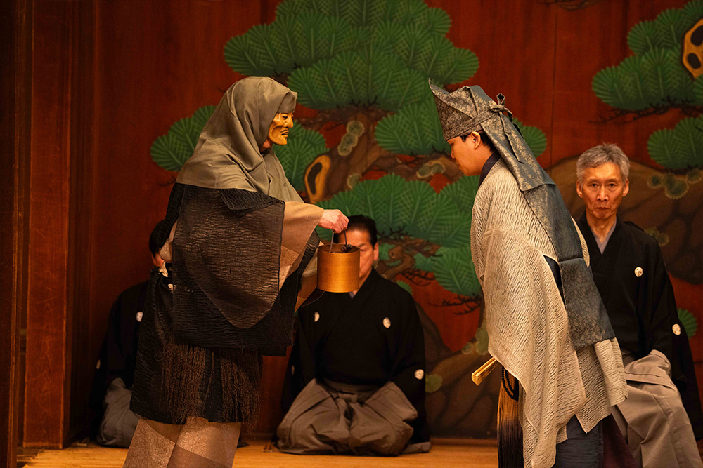 まずは能の舞台の「謡(うた)」から。この日の演目は、大槻文藏さんがシテ(主役)を務める『俊寛』。人間国宝である大槻文藏さんが能面をつけて演じる、心の機微が伝わる所作は、誰もが息を飲んで見入ってしまうほどの美しさ。衣擦れの音さえ聞こえる静寂のなか、笛や鼓の囃子、登場人物たちの謡曲は聞き惚れるほど荘厳で、あっという間に物語は終わりを迎えました。