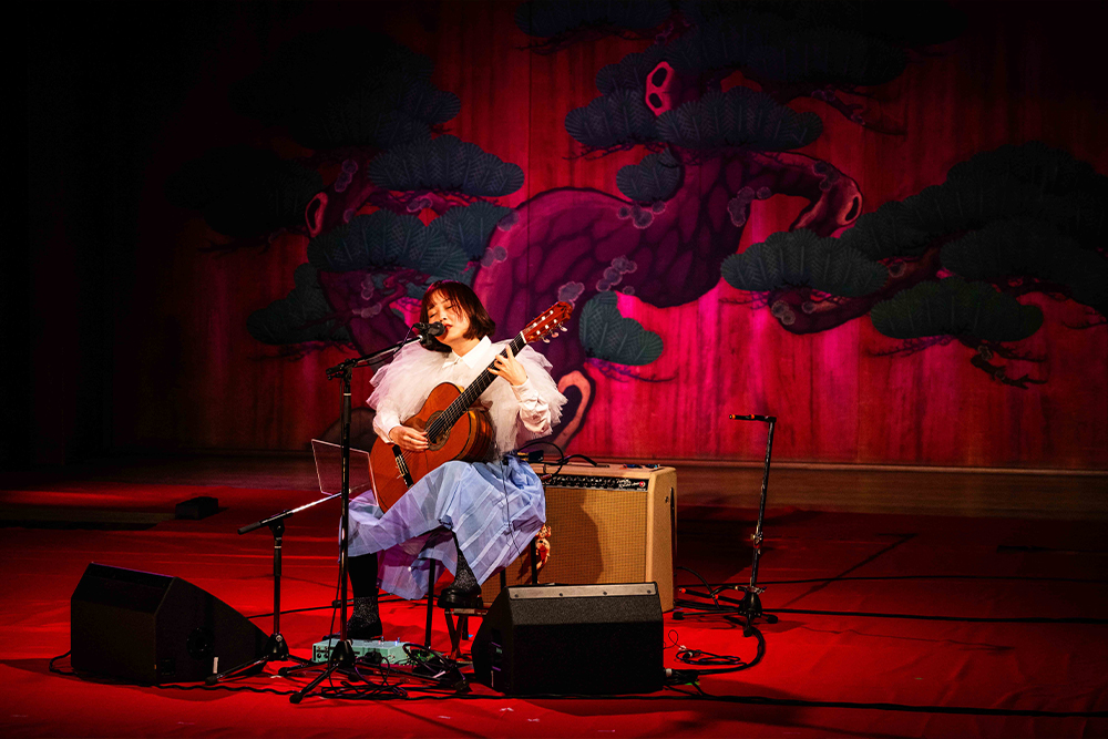続いては現代音楽の「歌(うた)」、シンガーソングライター・Reiさんのライブへ。デビュー10周年を迎えた彼女。この日はブルージーなギターをかき鳴らす『my mama』から、『How Deep is Your Love/Bee Gees』のカバーまで、多彩な楽曲を披露。『ORIGINALS』で爪弾くギターの旋律は彼女自身のストーリーを描いているようで、まるでひとつの物語を見ているかのようでした。能舞台の背景(鏡板)に描かれた老松は神が宿る依代を象徴したもので、たった一人、凜とした孤心を湛えるかのようにギターを弾きながら歌う姿は、能舞台に馴染んでいました。
