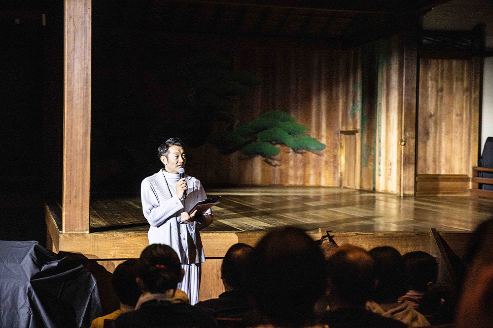 2日目も、イベントのナビゲーター・大抜卓人さんによる能楽の歴史や魅力の紹介から公演が始まりました。大抜さんは、3代将軍・徳川家光の時代、参勤交代で江戸に集った青森と鹿児島の大名の会話が成立しなかったことに端を発し、武士のたしなみである能楽の言葉が標準語の始まりとなったというエピソードを紹介し、「標準語に節回しをつけたのが謡曲、そこにジャンルの色付けが入っていったのがポップスやロック。点が線となる時代の流れを楽しんでいただける機会」と述べました。併せてこの日の演目「大会(だいえ)」のストーリーと見どころをわかりやすく説明し、客席の期待を高めていきました。