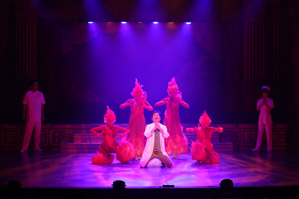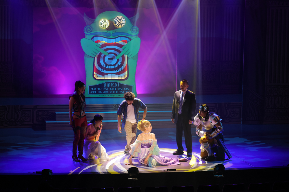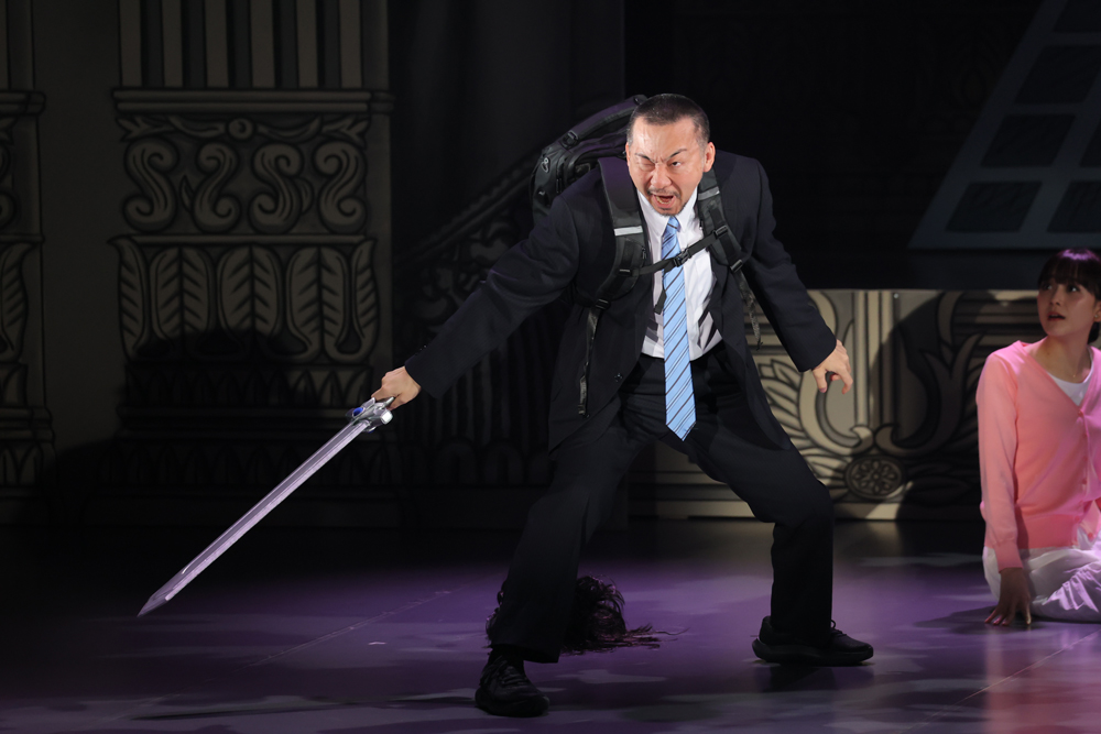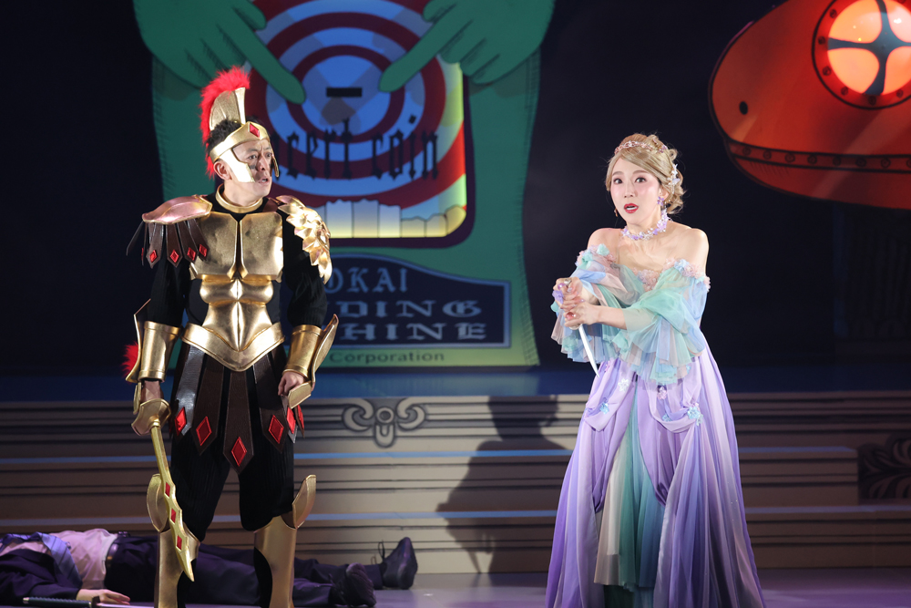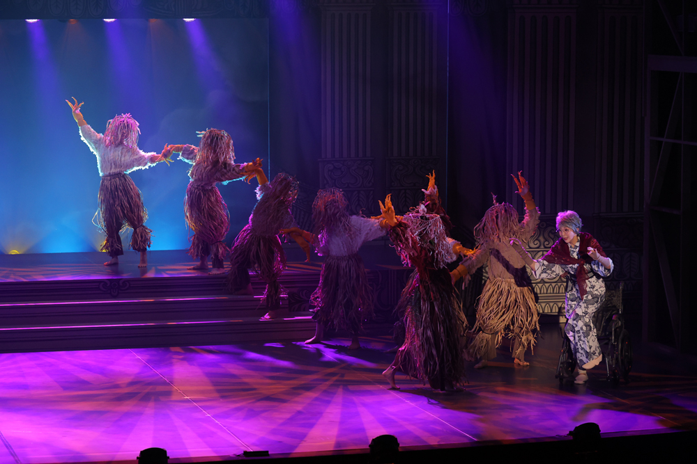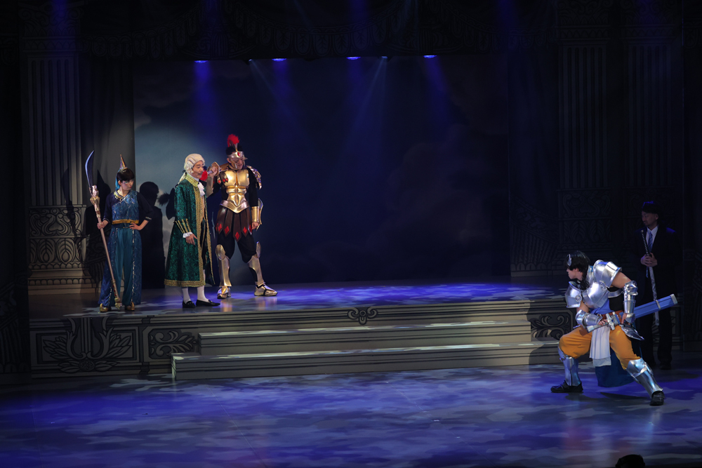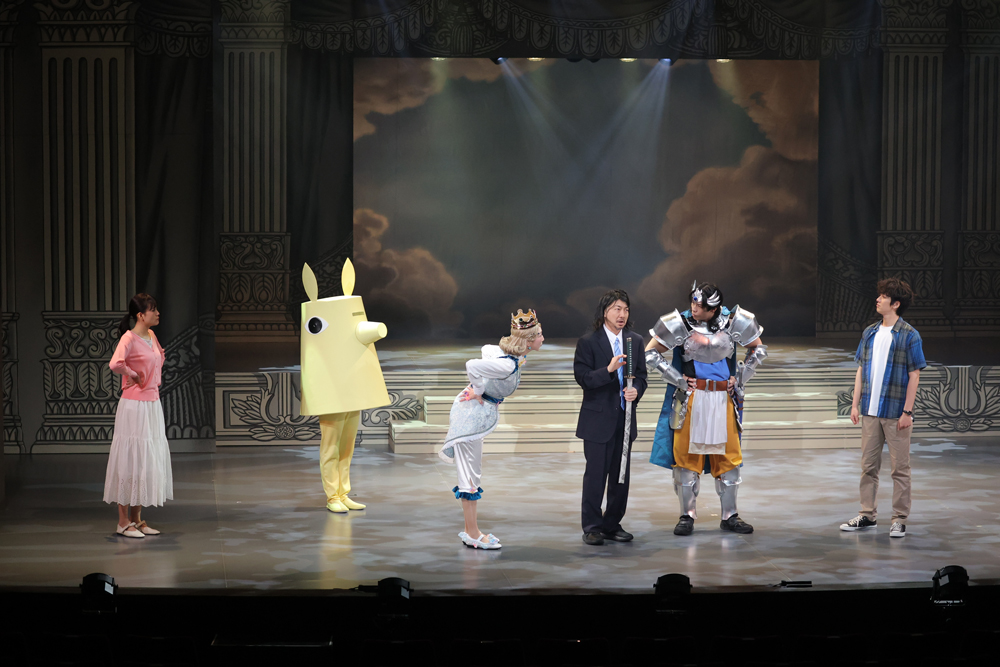 ストーリーに大きく影響するのが舞台に組まれた足場。姫たちのいる摩訶不思議な世界ともう1つ同時に進んでいる別世界。その2つをつなぐ場として、物語を俯瞰で見渡す需要な役割を果たします。さらに爆笑必至のアドリブシーンが繰り広げられるほか、まさかの飛び入りキャストが物語の重要なカギを握っているなど、楽しい仕掛けがあちこちに。しかし一転、目の離せないバトルから悲しみの展開へ。そこからの大どんでん返しはまさに圧巻。約150分の舞台はあっという間にエンディングを迎え会場は大きな拍手に包まれました。