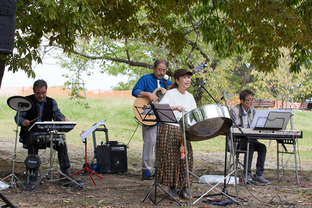 25日はSteeling Windが登場。スティールパン、ピアノ、ベース、ドラムのカルテットでの演奏です。開演時間になるとゆるやかなメロディが奏でられ始め、ライブがスタート。1曲目の「St. Thomas」から心地よい演奏に会場からは自然と拍手も起こります。2曲目はボサノバの名曲「イパネマの娘」。先週のジャズカルテットとはまた違ったアレンジで聴かせてくれます。MCでは「亀の甲羅みたいなところをスティックで叩き、リバーブの効いた生の音を出す楽器」とスティールパンの紹介も。そして「こんな季節にぴったり」と軽快なメロディの「風になりたい」から「秋桜」へ。続けて「スティールパンとして一番有名な曲」とディズニー映画「リトル・マーメイド」から「Under the Sea」を演奏。そしてこれからの季節の定番ということで「Autumn Leaves」、ラストは「On The Sunny Side Of The Street」で締めくくりました。
