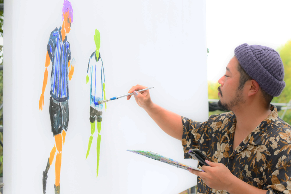 普段は大阪で活動し、ポップな作品を描くことが多いというLANPさん。今回の作品のタイトルは「大阪の音楽と文化を満喫する週末&自然と音楽の調和」。作品製作中に、前を通りかかった人を描いたとのこと。ライブペインティングの魅力はプレッシャーと緊張感、新しいものが生まれるところ、と話してくれました。