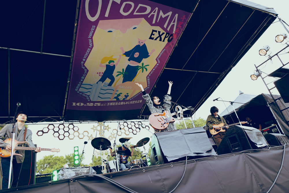 25日には「OTODAMA EXPO~千里丘編~」を開催。人気アーティストたちがセルシーSTAGEとHALLO’S STAGEに分かれ、交互にライブを行っていきます。まずHALLO’S STAGEに登場したのは、ウェルカムアクトのNagakumo。大阪発の男女4人組ネオアコバンドです。ボーカル・サヤさんの「Nagakumoです、よろしくお願いします」のあと、1曲目はミディアムなテンポが心地いい「スウィート・スペース」、そして2曲目は少しアップ目の「6月は愛について」へ。オーディエンスもバンドが奏でるメロディに身を委ねていきます。跳ねるビートが気持ちいい「日曜前夜」まで3曲通して続け、「大好きなこの場所で歌うことができてうれしいです」と話すと、会場からは拍手が。そこからも「思いがけず雨」、「Awayokuba」、「Bedtime Bear」まで全6曲、フレッシュな音を楽しませてくれました。