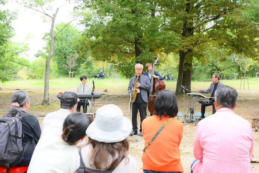 現代美術の森では、大阪を拠点に活動する歴史あるジャズバンド、アロージャズオーケストラがプロデュースするジャズカルテットによる「現代美術の森の音楽会」を開催。18日は、サックス、ピアノ、ベース、ドラムという4人編成のアロージャズスペシャルが登場しました。まずはスタンダード・ナンバー「But Not For Me」を。緑に囲まれた会場に響くジャズは格別。各プレイヤーのソロが終わるたび、会場からは拍手が起こります。MCでは「会場が土の上で平らでないからみんな傾きながら演奏している」と笑わせると「イパネマの娘」に。3曲目は軽快なメロディの「There Is No Greater Love」。続いては打って変わってメロウなメロディが胸に染みる「Over the Rainbow」へ。雨がぱらつくあいにくの天候でしたが、オーディエンスはしっかりと上質なジャズを楽しみました。