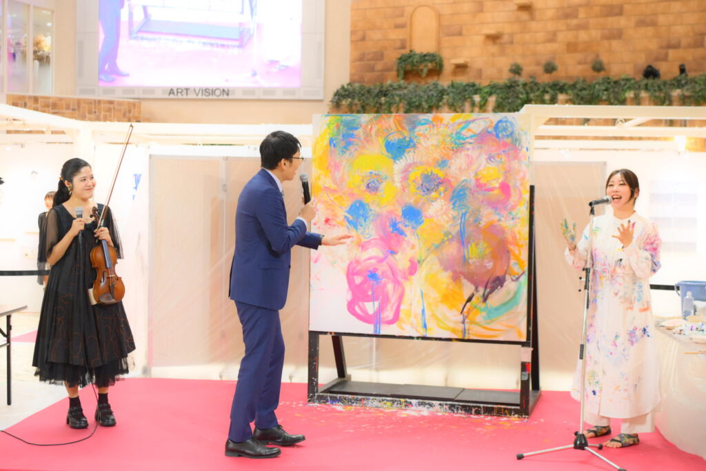 松元さんがJ.S.バッハの「プレリュード」を軽やかに奏で始めると、白いワンピース姿のsilsilさんがキャンパスに躍動感たっぷりにカラフルな色をのせていきます。序盤、手の平を大胆に使う技法で女性の顔を描くと、描いた目をウィンクさせるなどして表情を変えていきます。松元さんの美しいヴァイオリンの音色も絵とリンクするよう。後半3分、松元さんと目をあわせると、勢いよく筆を走らせるsilsilさん。すると美しい女性の顔が消えて、あっという間に花畑のような色彩に。最後まで目が離せないライブペインティングとなりました。