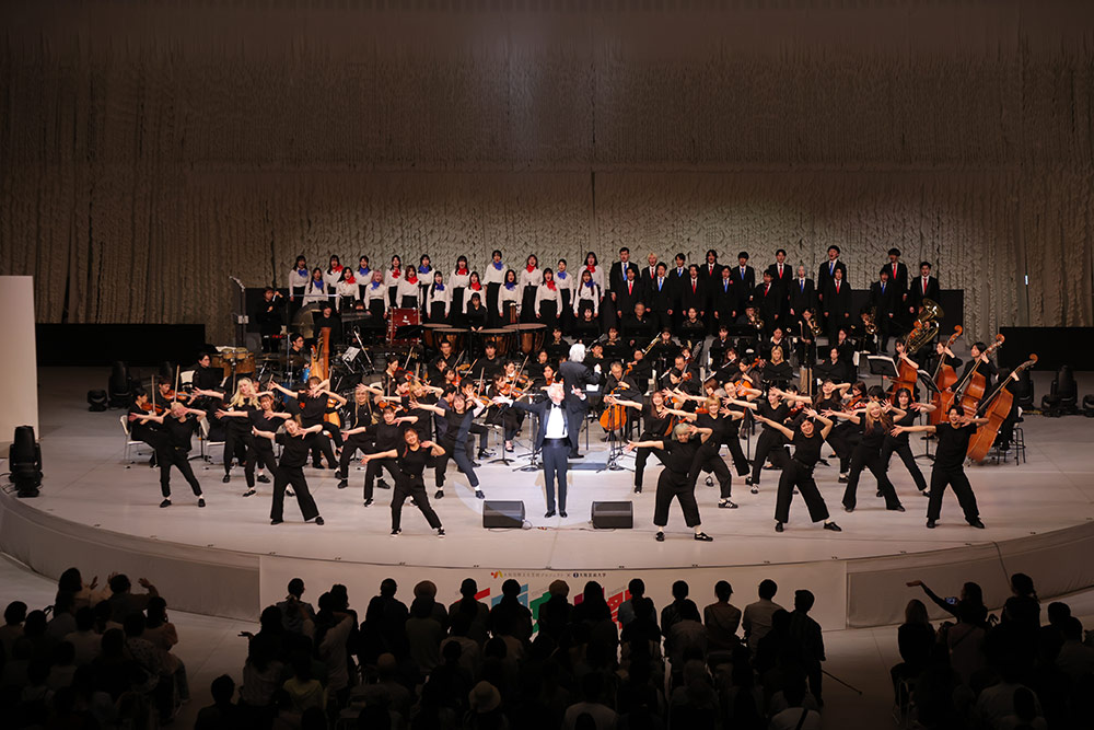 そして最後のプログラムは、「オーケストラ×globeメドレー」。1990年代、日本ポップス史上に数々の金字塔を打ち立てたユニット「globe」のヒットナンバーをオーケストラによるメドレーで届けるスペシャルプログラムで、ステージにはマーク・パンサーさんが登場! まずはミリオンセラーを記録した「DEPARTURES」、そして「Can’t Stop Fallin’ in Love」と続きます。演奏が始まると会場から自然にクラップが巻き起こり、会場の熱気は最高潮に。学生たちの歌声、重厚な演奏と、マーク・パンサーさんによるラップのコラボレーションは、原曲とはまた違った魅力に溢れていました。そして「Feel Like dance」ではダンサーもステージに。演奏に合わせて観客全員が両手を挙げて左右に振り、「globe」の名曲によって会場が一体感に包まれました。