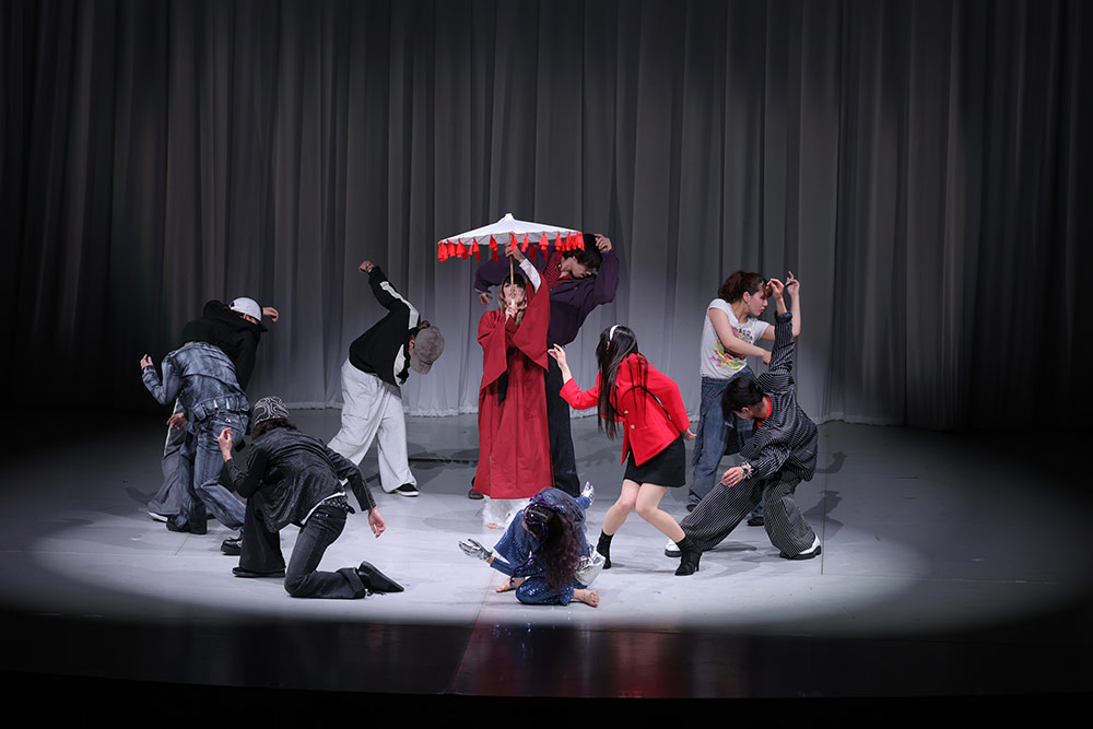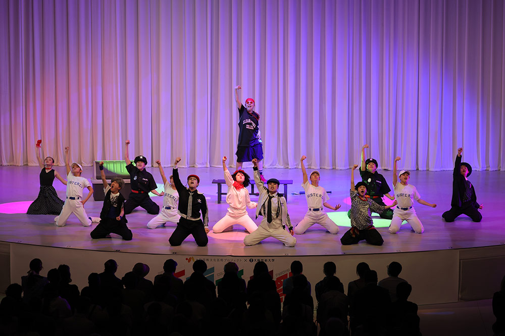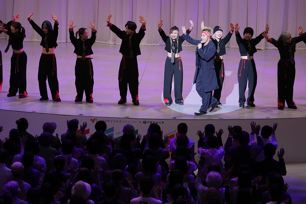 続いては、世界大会で多数の優勝歴を持ち、国内外で活躍するダンサーのIPPEIさんと、IPPEIさんが教員を務める大阪芸術大学ポピュラーダンスコースの生徒たちとのコラボレーションです。クリエイティブに溢れたダンスは会場いっぱいにエネルギーを広げていきます。一糸乱れずシンクロさせるパフォーマンスもあれば、迫力のアクロバットや細やかなムーブで魅了するサイファーもあり、それぞれの個性も際立ちます。最も盛り上がったのは、観客を巻き込んでのパフォーマンス。クラップなどを織り交ぜた両手だけでできる振り付けで、会場は一体感に包まれます。