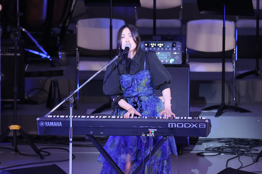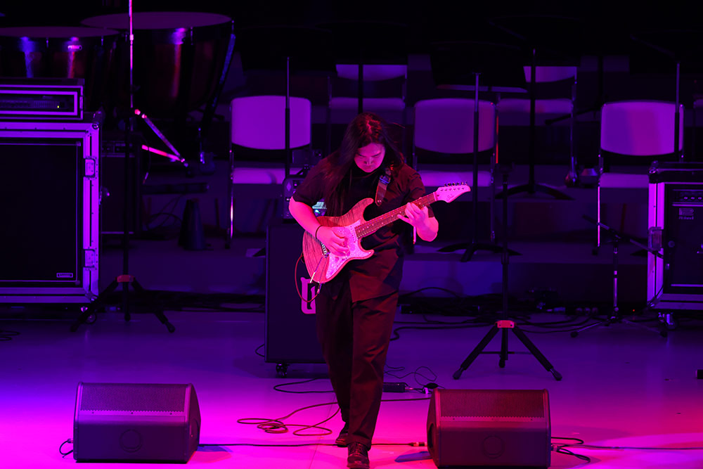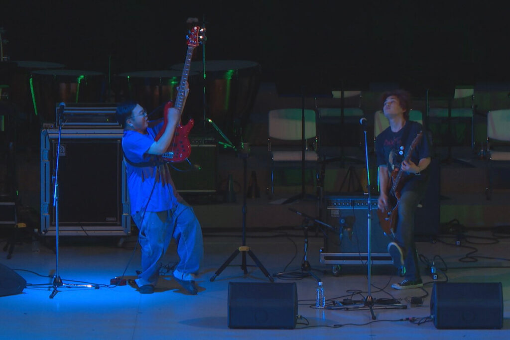 次は大阪芸術大学ポピュラー音楽コースの生徒たちによる演奏です。1組目のバンド「満月band set」は、厚みのあるバラードで独特な世界を醸し出し、たちまち観客を魅了しました。(2回目の公演では、1組目のバンドとして「DOOG」が登場し、力強い演奏を披露しました。)2組目は「匠ngwie malmsteen」。超絶技巧が次々と飛び出すギターの驚異的な速弾きのインストゥルメンタルに、「フォー!」と歓声が送られました。