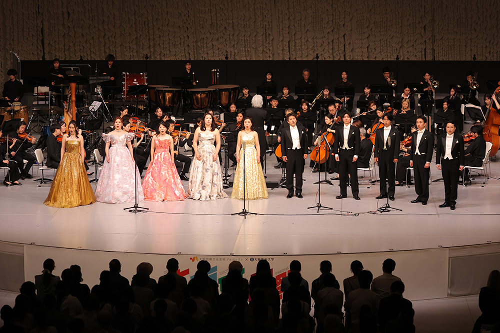 後半は、オーケストラを中心としたプログラムです。演奏は、大阪芸術大学管弦楽団の皆さん。そして指揮を務めるのは、日本の音楽界をリードし続けている日本を代表する指揮者・大友直人さんです。まず披露するのは、「ヴォーカルアンサンブルOSAKA」とのコラボレーション。「ふるさと」や「春の小川」など、歌い継がれてきた日本の歌や、オペラ「トゥーランドット」、「交響曲第9番(第九)」の名曲で観客を魅了。続くオーケストラ演奏では印象に残る「ウィリアム・テル」序曲で迫力のある演奏を届けました。