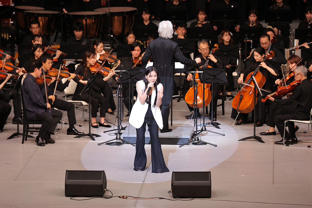 大阪芸術大学混声合唱団とのコラボレーション「オーケストラ×アニソン」も繰り広げられました。「ワンピース」の主題歌「ウィーアー!」「新時代」のメドレー、そして「宇宙戦艦ヤマト」より「序曲~宇宙戦艦ヤマト」が披露されました。さらに、「ふしぎの海のナディア」の楽曲では、「ブルーウォーター」を歌う大阪出身の歌手で、大阪芸術大学演奏学科教授でもある森川美穂さんがステージに。パワフルな歌唱とダイナミックな演奏が重なり合う、特別なステージとなりました。